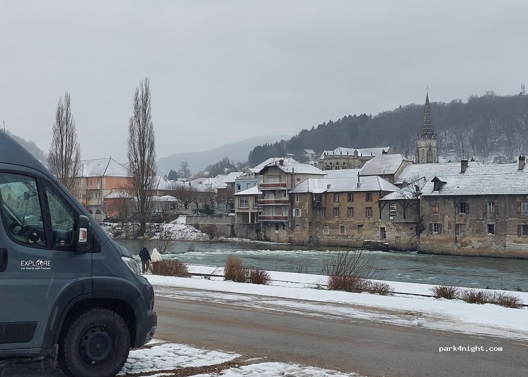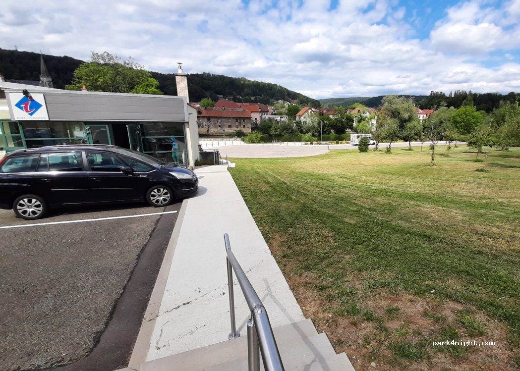 In der Stadt, neben dem Tourismusbüro und der Kanuabfahrt, am Ufer des Doubs. Vom Fremdenverkehrsamt bestätigter Parkplatz.