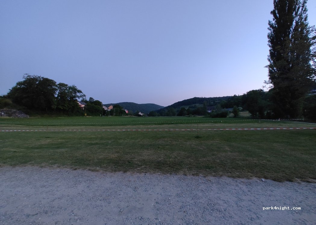 Stellplatz neben Freibad, Übernachtung erlaubt. Dusche/WC, Restaurant im Freibad möglich. Kein Strom.