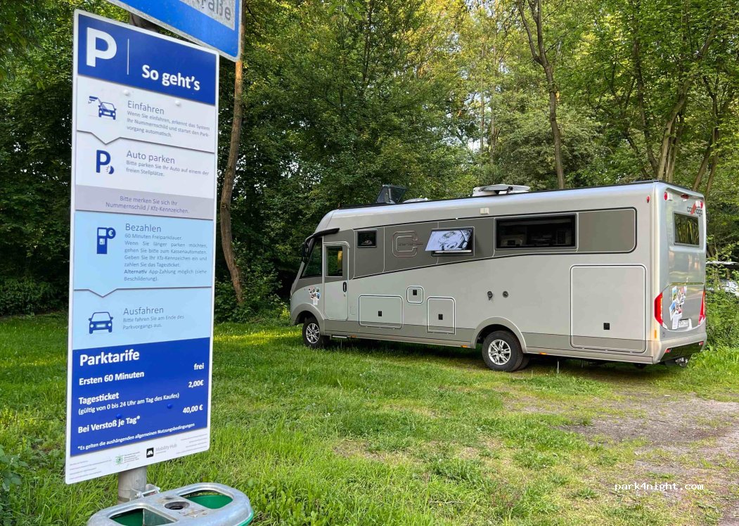 Parking at Unterbacher See. First hour free, day ticket 2 € (number plated gets scanned at entrance, payable in cash, with card or app). Access possible at any time, no barriers or height restrictions. Very crowded during the day in good weather. Parking lot is also suitable for large mobile homes in the rear area. Shady areas under trees. Access to the lake is only possible when the swimming pool is open. High ropes course also within walking distance. Bus stop also in the immediate vicinity of the south campsite