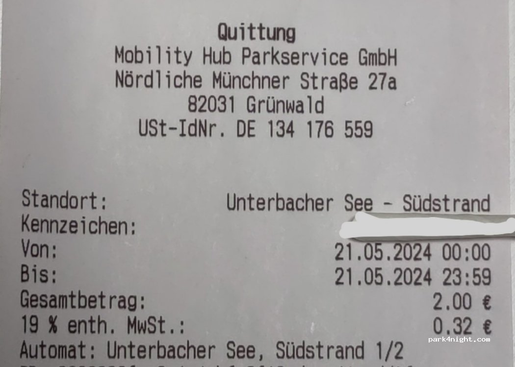 Vorsicht raffinierte Abzocke: Es sind NICHT 24h, sondern ein neues Tagesticket beginnt um Mitternacht. Siehe Foto. Übernachtung kostet damit 4€ - oder 46€ incl Strafe wenn man morgens kein zweites Ticket kauft. Ansonsten ein lauschiges Plätzchen, Autobahn-Nähe nicht schlimm - und das Vogelgezwitscher ist wundervoll. Wurde nicht belästigt.