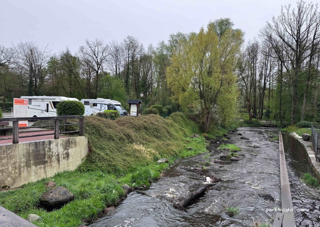 Très bel emplacement, 6 places pour CC bien indiqués. Chaque emplacement a sa poubelle. La rivière avec le moulin sont magnifique, petit parc à côté. Attention le point en bois fait du bruit et les voitures passent dessus très tôt le matin. Prévoir bouchon pour oreilles sensibles