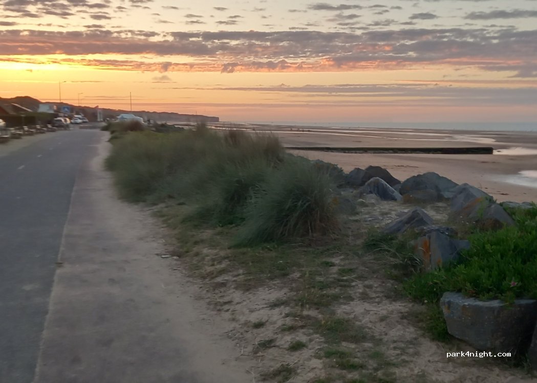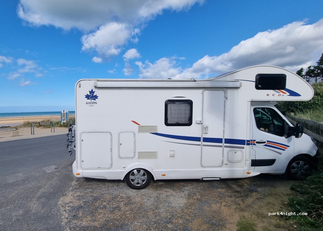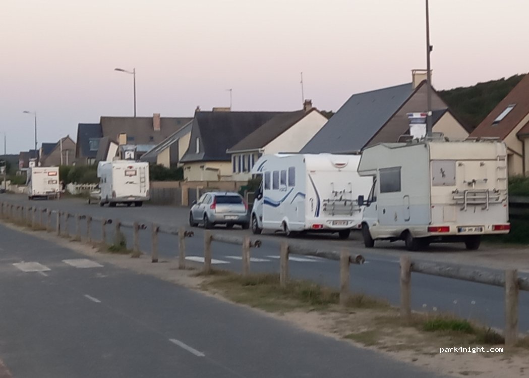 De grandes places le long de la route devant les maisons , plage et piste cyclable en face, idéal pour voir les monuments de commémoration ou marcher le long de cette longue plage. se garer le matin si l'on veut trouver une place. Nuitée interdite et c'est normal vu l'emplacement, il faut respecter et se faire discret si l'on veut que les mairies continuent de nous tolérer.