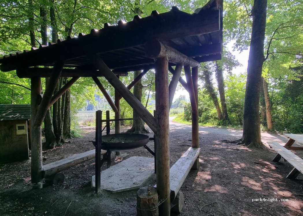 Schattiger und flacher Platz, Parkmöglichkeit auf dem asphaltierten Parkplatz oder direkt am Waldeingang. Überdachter Grillplatz vorhanden. Die Autobahn hört man aber schon von weitem. Am Rande des Sees, aber nicht möglich zu schwimmen.