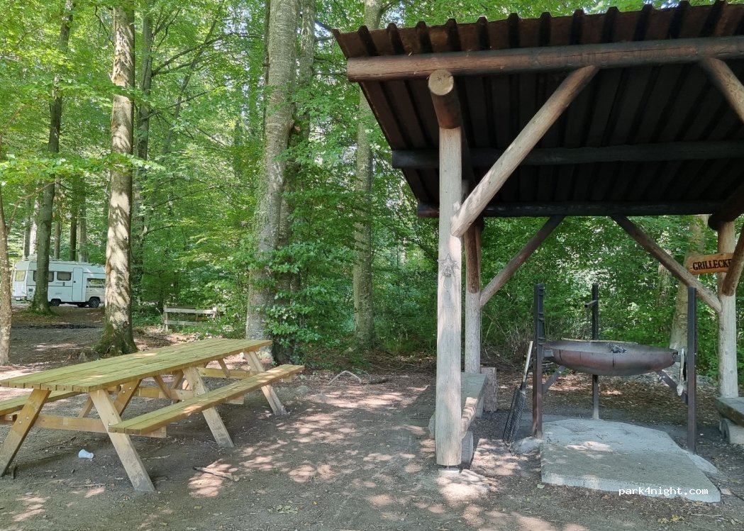 Endroit ombragé et plat, possibilité de se mettre sur le parking en bitum ou juste a l'entrée de la forêt. Barbecue abrité à disposition. On entend l'autoroute mais de loin. Au bord du lac mais pas possible de se baigner.
