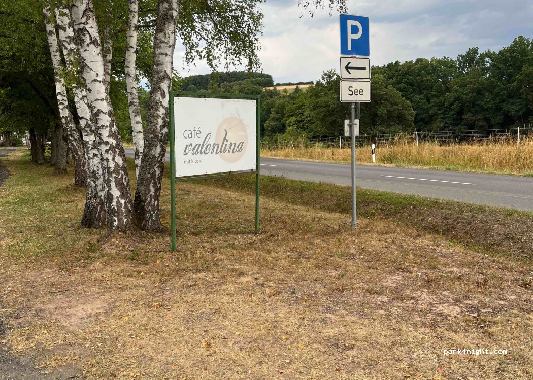 Quiet parking lot at a bathing lake. The place is on a quiet street without much traffic. The adjoining cafe is said to only be open on Sundays.