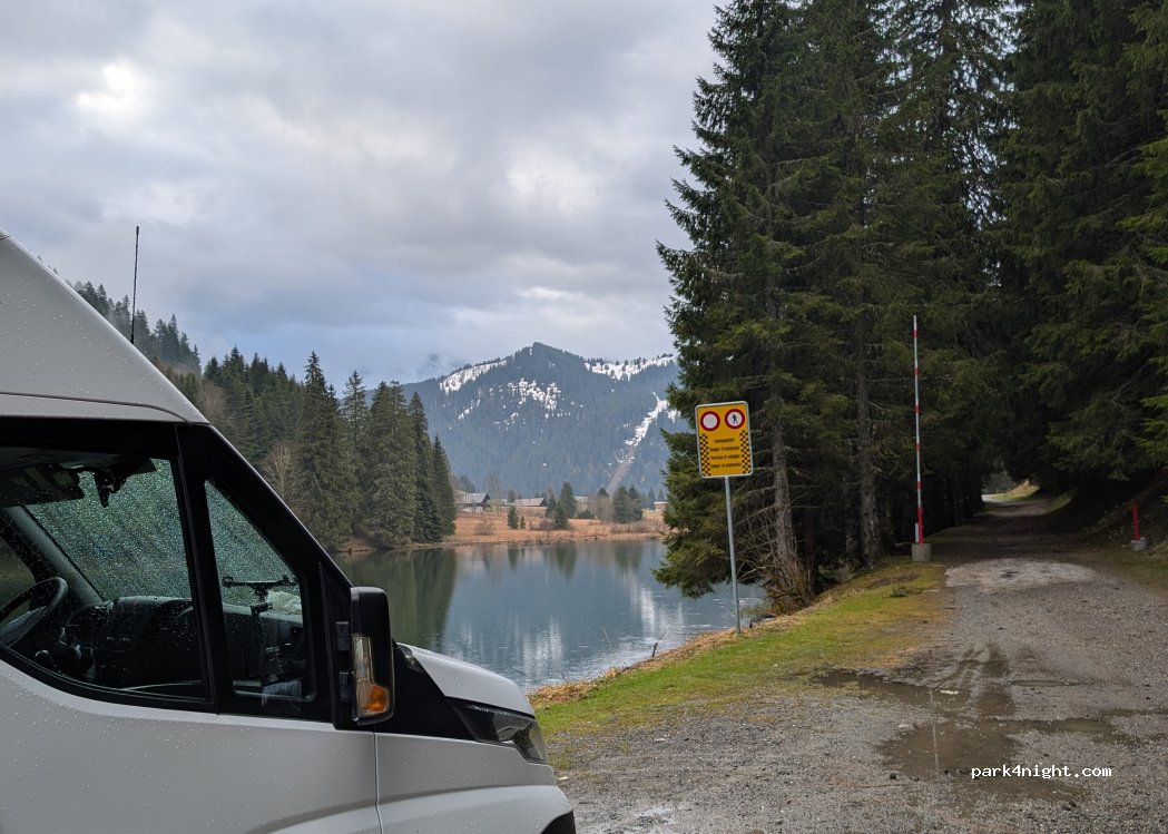 Calme la nuit. Pas beaucoup de place mais joli petit lac et bel emplacement. Un peu de boue sur la route.