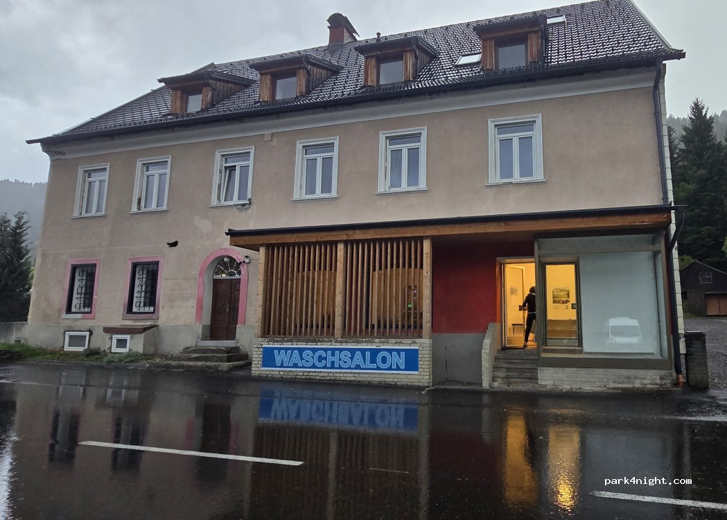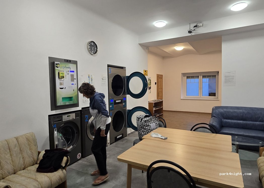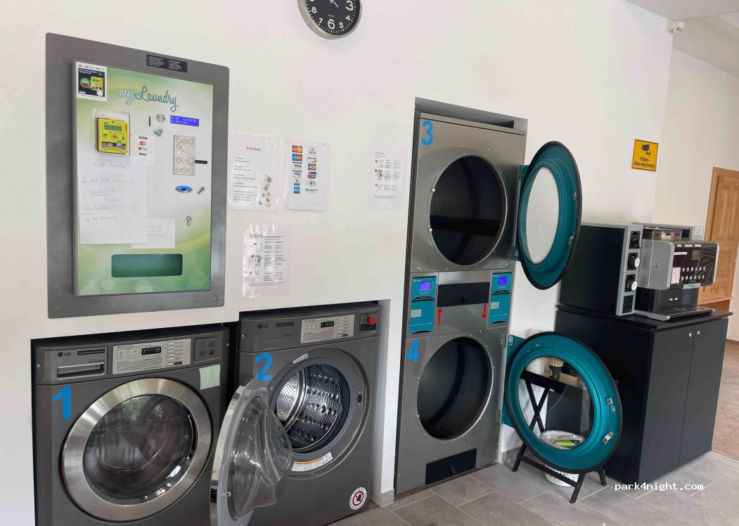 A nice little laundromat, with possibility of sitting down, drinking a coffee, reading books .. there is a big parking in front of it and a bakery next to it.