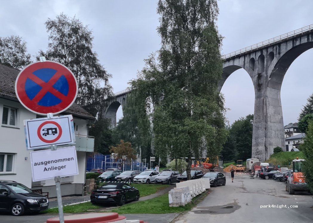 Parkplatz unter dem Viadukt. Wenig Eisenbahnbetrieb. In der Woche gebührenpflichtig. Nicht direkt an der Hauptstraße.