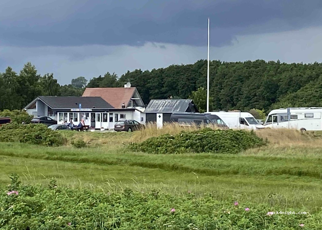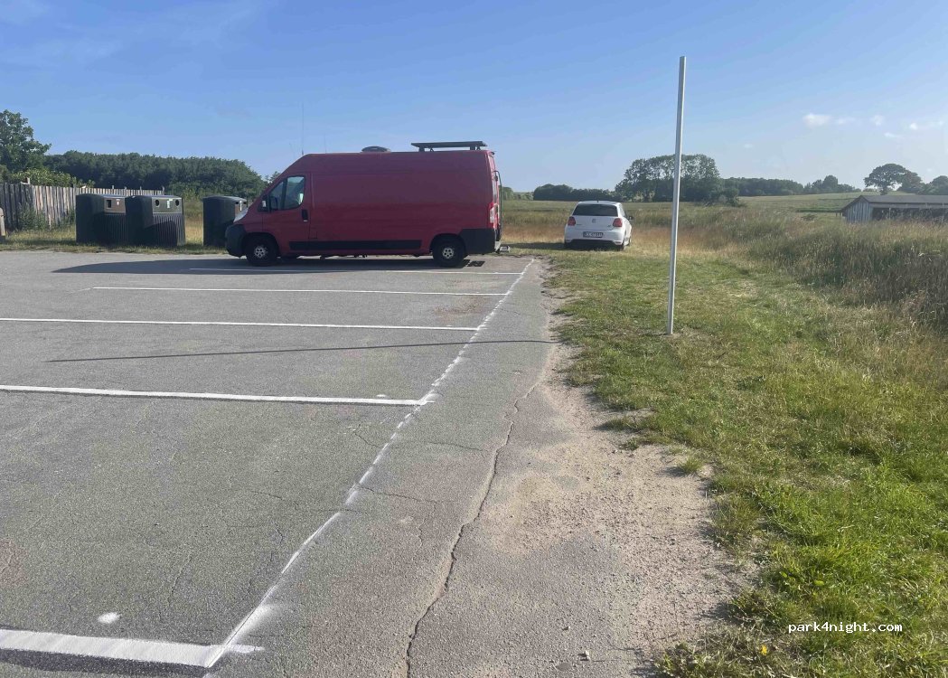 Ganz am Ende der Straße, über die Parkfläche des Imbiss hinaus, gibt es Platz auf einer leicht hügeligen Fläche in der Übernachten nicht verboten ist. Hier sind wir geblieben. Imbiss ist sehr lecker. Schöner Blick auf den kleinen Belt und schöner Strand.