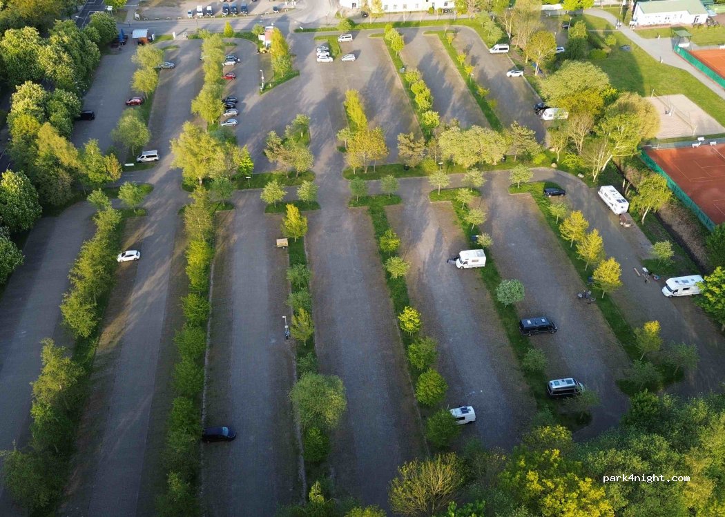 Großer Parkplatz, auf dem man eine ruhige Nacht verbringen kann. Allerdings sollte man die Parkplätze direkt am Rand Richtung Tennisverein meiden, da die Hecken tagsüber und Abends gerne als Toilette genutzt werden. Sehr unangenehm, wenn man da gerade mit seinem Camper steht.