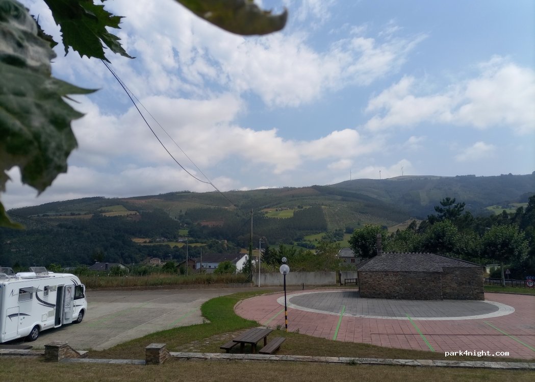 El acceso no es malo con una autocaravana de 7,30 metros sin problema. Área tranquila con muchos merenderos y un par de columpios. Por la noche apenas se escucha la carretera. En la parte baja del pueblo se puede hacer el descenso en canoa del río Eo.