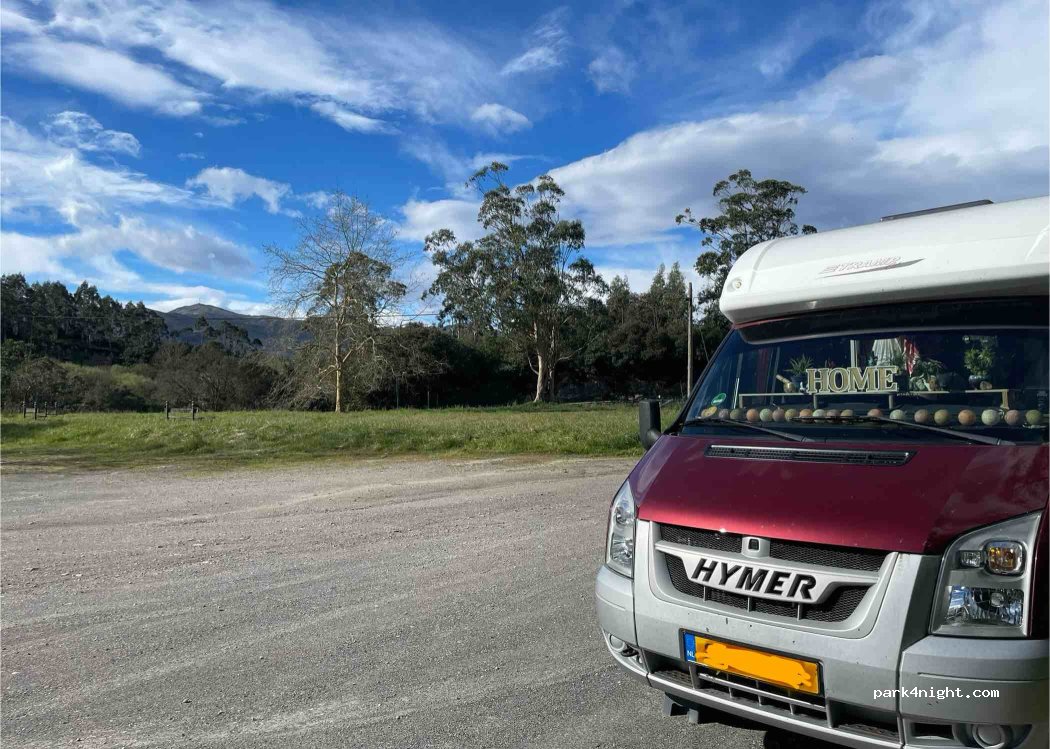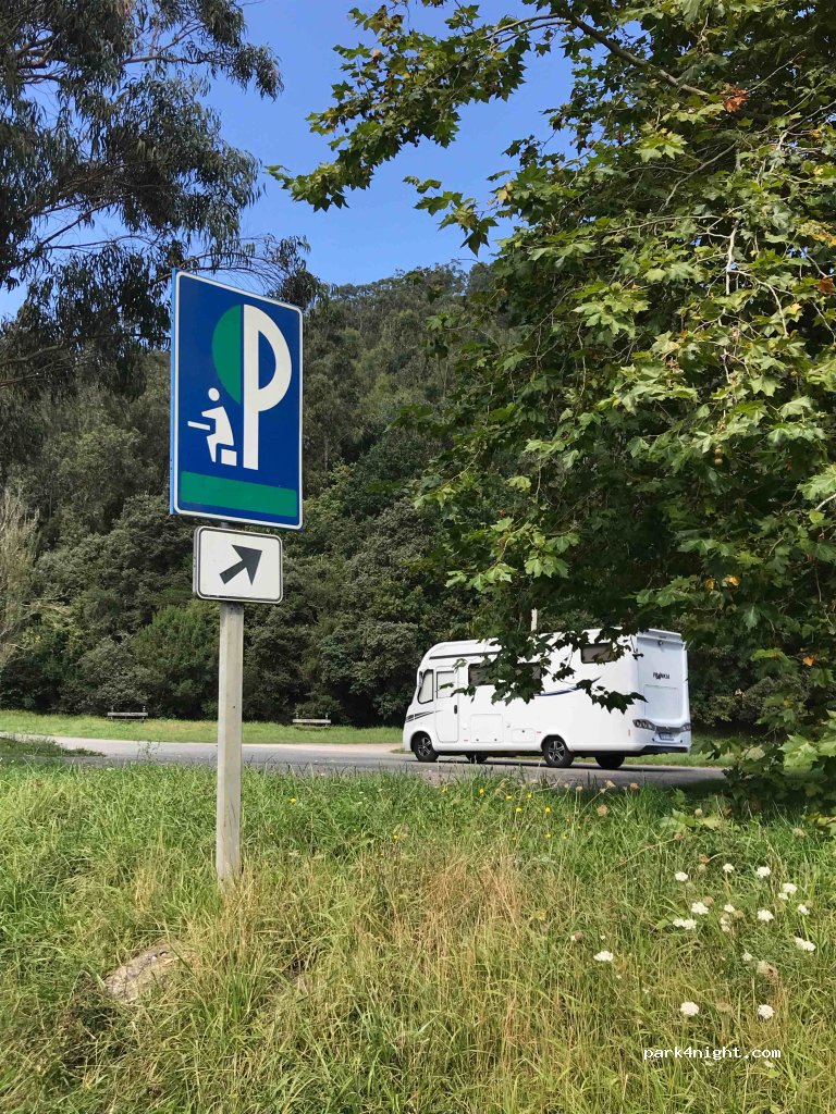 Al lado de playa franca para pasar una noche y el dia. Es de hierva y piedras, no tiene ni contenedor de basura pero es tranquilo. Se puede hacer alguna ruta con Wikiloc. Justo a la izquierda al fondo hay un caminito que lleva a la playa, eso si, tiene que haber marea baja porque sino, el rio esta crecido y no se puede pasar. Otra opcion es ir al parking de la propia playa que esta mas adelante.