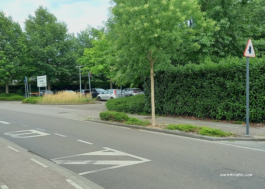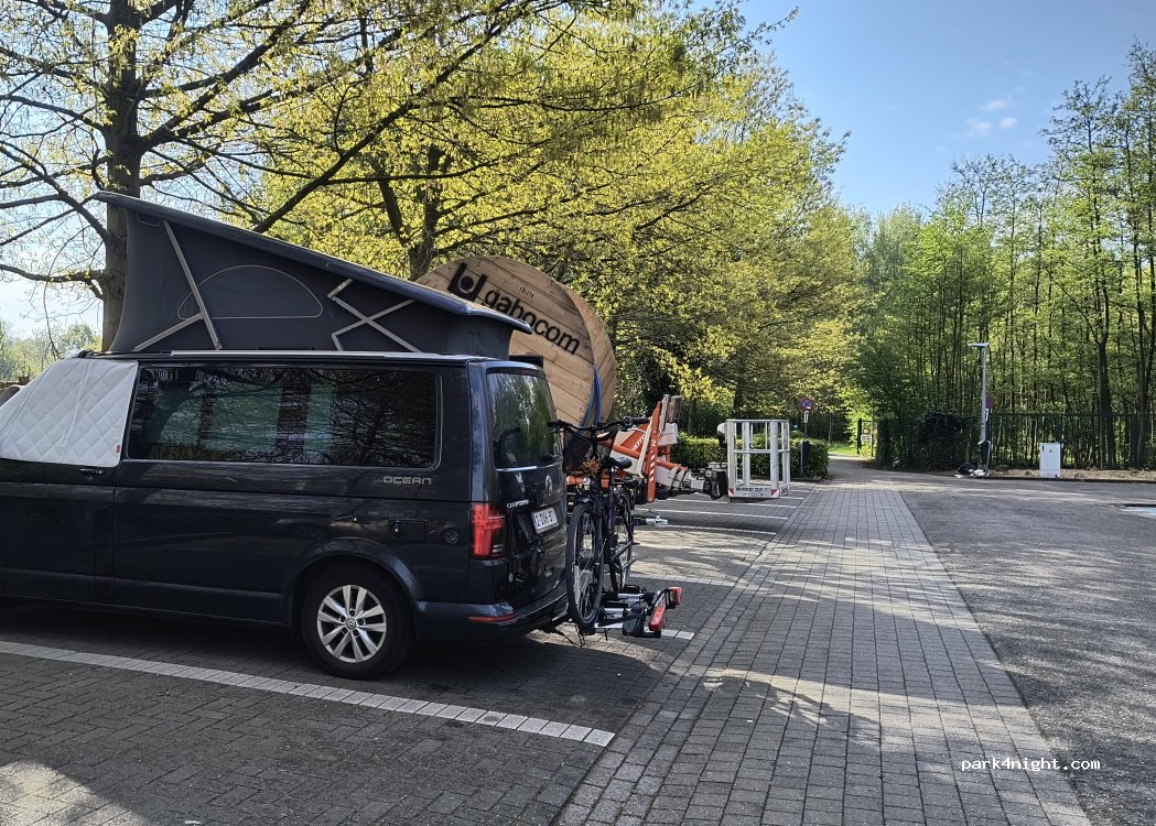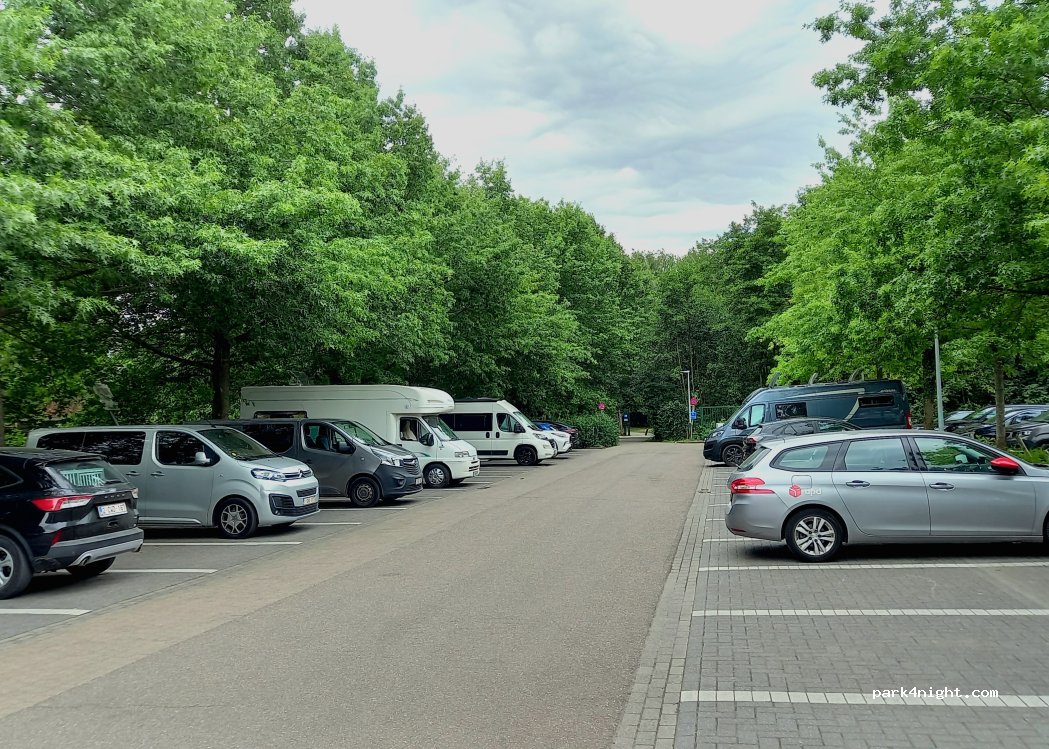 Parking con plazas para turismos, dando algunas vueltas encontramos sitio para nuestra AC de 7,5m (metiendo la parte trasera encima de arbustos). Es el parking P4 de una gran zona verde perfecta para pasar el día con niños (muchas zonas de juego, piscina al aire libre, canchas de fútbol y otros...). Por la tarde se llena. Visitamos Lovaina desde aquí en bici también.