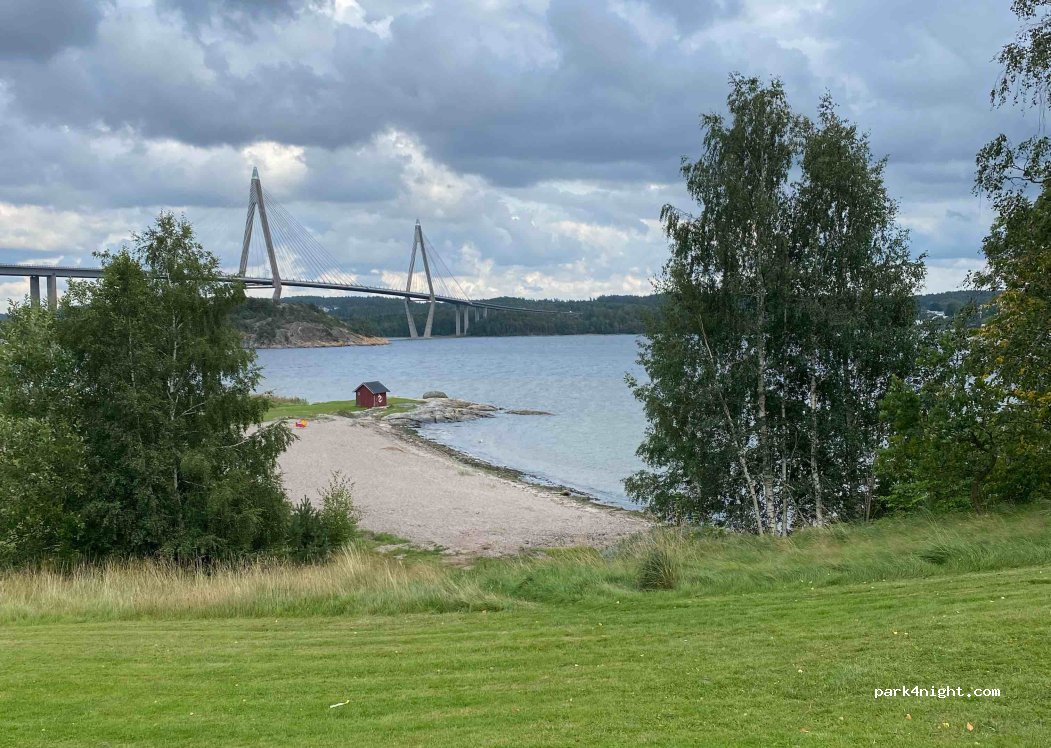 Super toll gelegener Campingplatz, direkt neben einem Naturreservat mit wunderschönem Ausblick in den Fjord und auf Brücke. Hüpfburg und Hüpfkissen sowie Spielplatz am Eingang und neben dem Strand für die Kids (Hüpfkissen leider schon abgelassen), Duschen und WC sehr sauber und modern, Regendusche+Handbrause. 565 SEK ist fett, ja, aber Stellplatz mit Terrasse+Strom,Wasser,heiße unbegrenzte Dusche