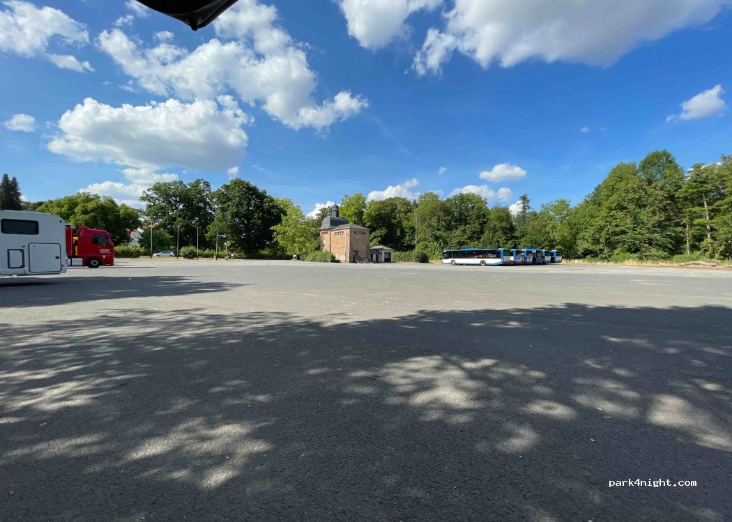 Large parking lot on the main road, right in the town, quiet on Sunday day. I didn't stay overnight myself, but there were a few mobile homes there. Toilets were locked. During the day there was a row of trees that provided shade, the rest were in the sun. Lots of forest invites you to take long walks.