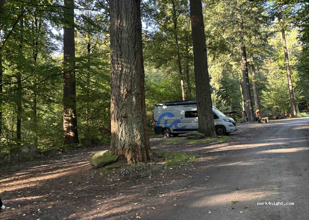 Schön gelegen im Wald, Straße Nachts kaum befahren. Morgens (Sonntag) viele Wandere und Spaziergänger aber alle sehr freundlich. Es gibt eine kleine Überdachte Bank, leider kein Mülleimer, daher BITTE Müll wieder mitnehmen!
