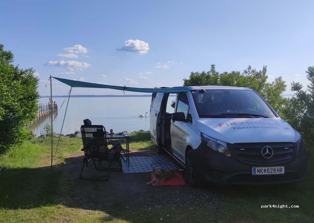 Piccolo campeggio direttamente sul lago,tranquillo e pulitissimo. All’interno piscina,ristorante molto buono (cucina tipica) con prezzi onesti. 53€ a notte camper con due persone, elettricità e CS compresi. il campeggio è solo pagamento cash, unico dato per me negativo. Proprio davanti il treno che porta a Tapolca e alle spiagge lungo il lago e parte la bellissima ciclabile che fa il giro del lago
