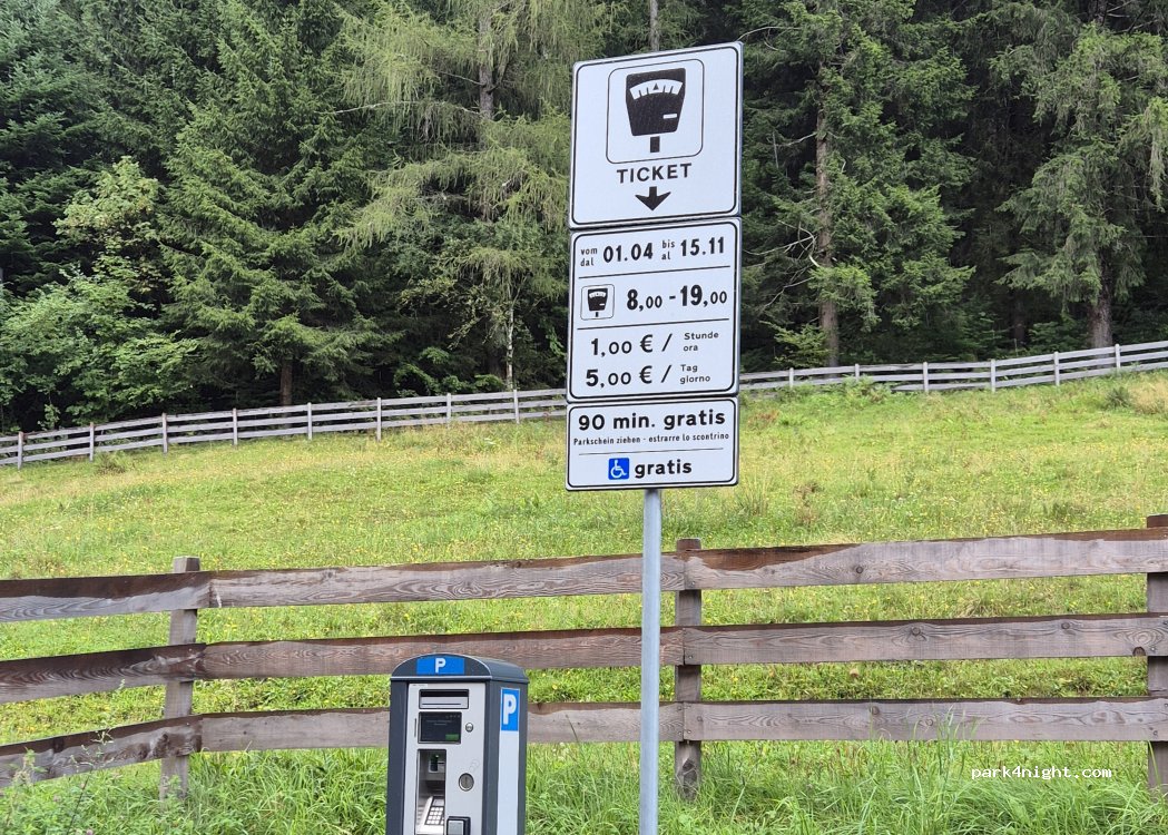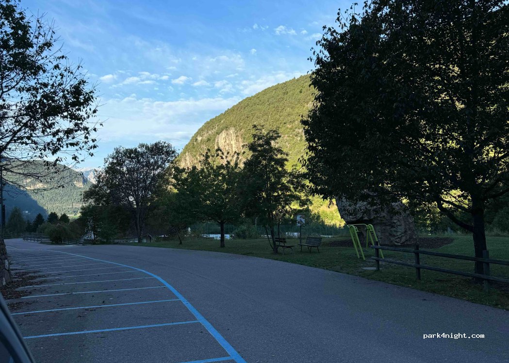 Questo e il parcheggio della zona sportiva ( campi tennis, calcio, ecc)....non va confuso con quello più lontano dal paese in cui segnalano un limite d'altezza. Qui ci si arriva comodamente! Purtroppo però dal 2024 è a pagamento e hanno segnato righe blu molto corte: il nostro van 6 m non ci sta!!! pagamento: 1,5 ore gratis, poi 1 euro ora o 5 tutto il giorno. Abbiamo comunque dormito bene!!!!