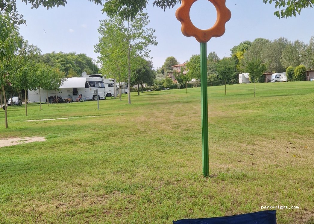 Camping amb una gran extensió verda, amb picina inclosa. Sanitaris amb aigua calenta (previ pagament de tarjeta per consum electricitat de 10€ que es retorna l'import no consumit). Disponibilitat buidar aigües grises, WC i omplir dipòsit d'aigua. Dos nits 2pax 59€. El poble Borghetto és turístic però molt bonic, val la pena visitar-ho i si voleu sopar IL Stapo, recomenat pels propietaris.
