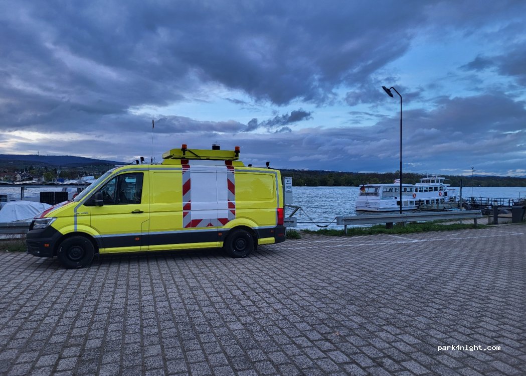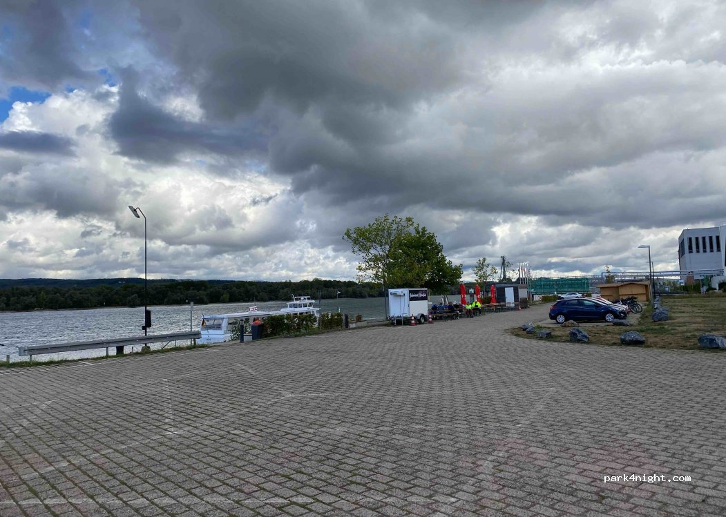 Parkplatz direkt am Rhein mit toller Aussicht, Bänken, einem kleinen Strand, toller Natur und schön, um den Sonnenuntergang zu genießen. Abends durchaus viel Betrieb. Im Sommer kleine Strandbar nebenan. Die benachbarte Fabrik hört man. Eher für Vans als für Wohnmobile. Wenn nicht viel los ist, dann kann man auch mit dem Wohnmobil dort stehen.