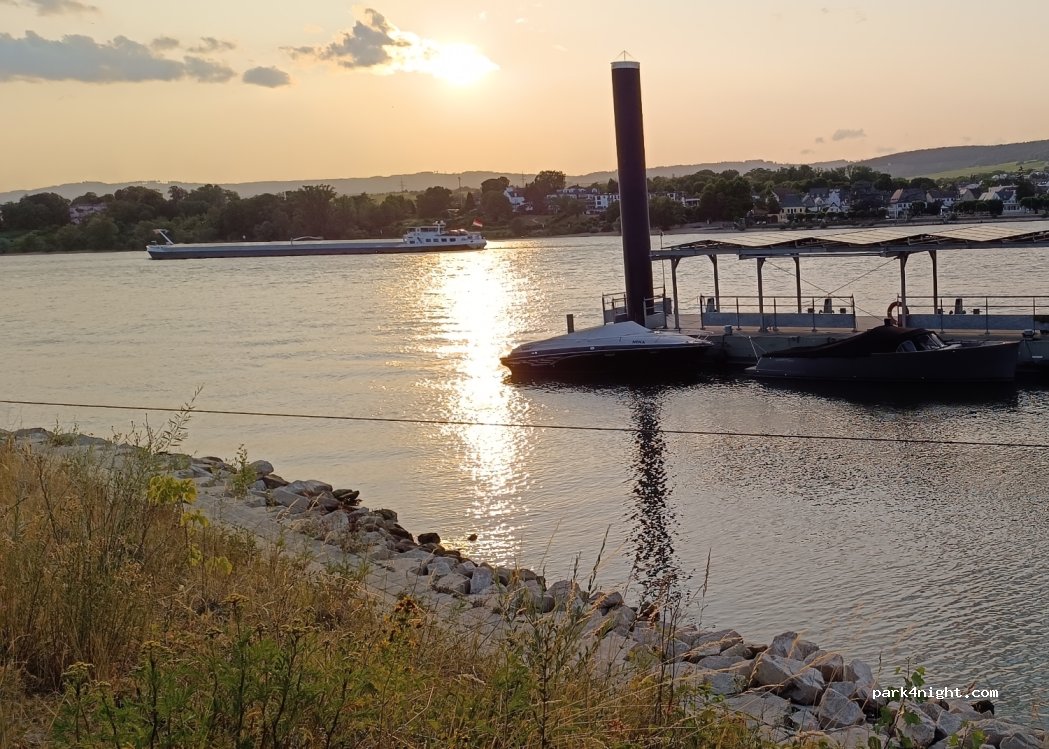 Parking right on the Rhine with a great view, benches, a small beach, great nature and nice to enjoy the sunset. Quite busy in the evening. Small beach bar next door in summer. You can hear the neighboring factory. Rather for vans than for motorhomes.