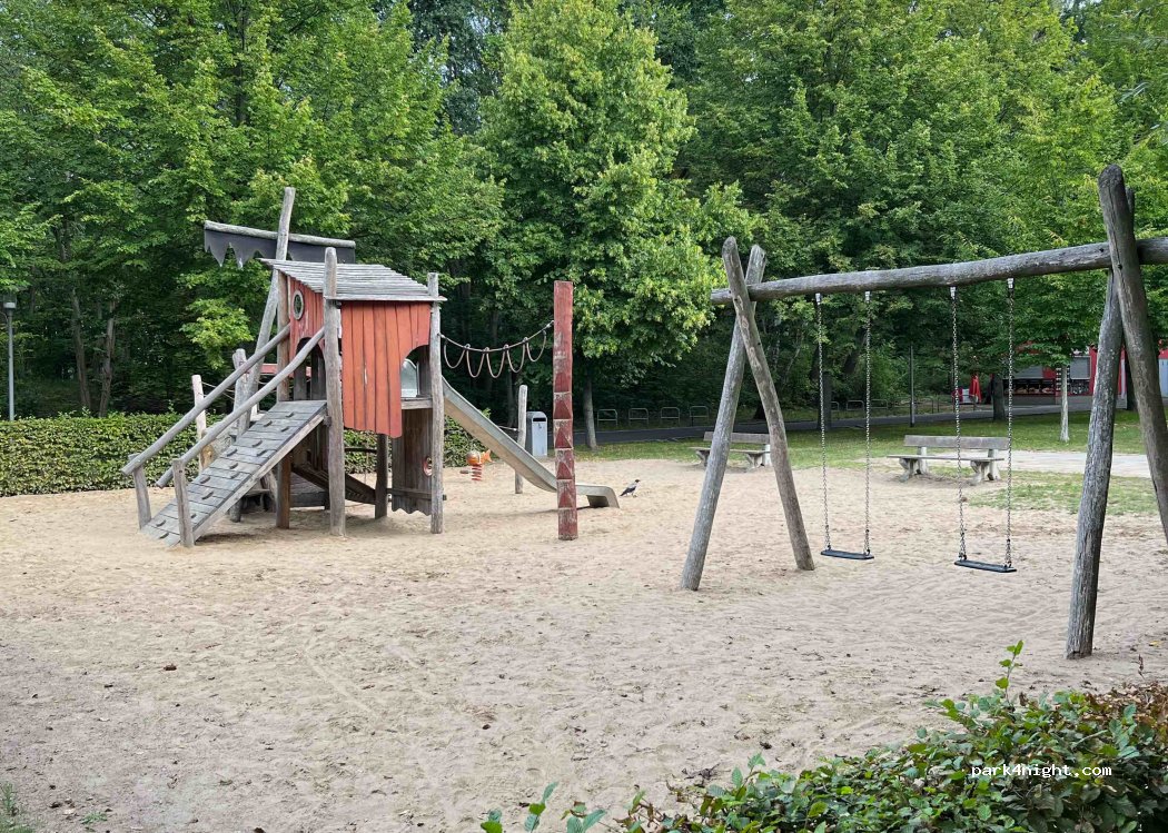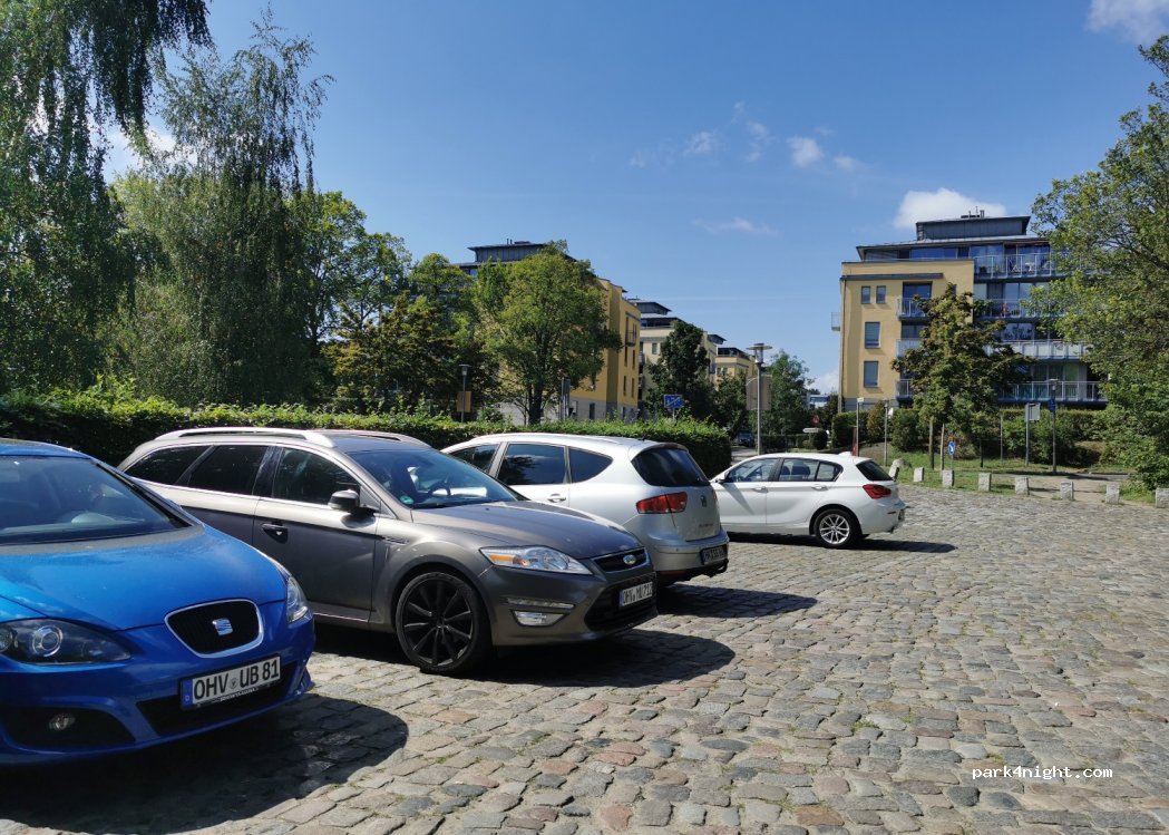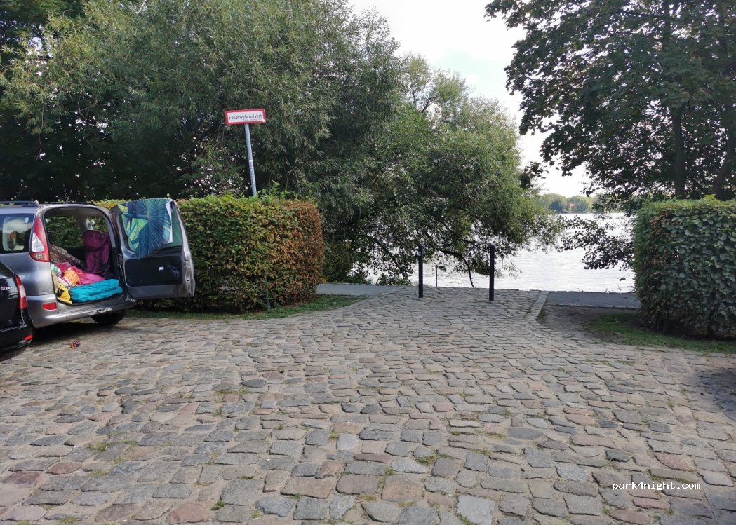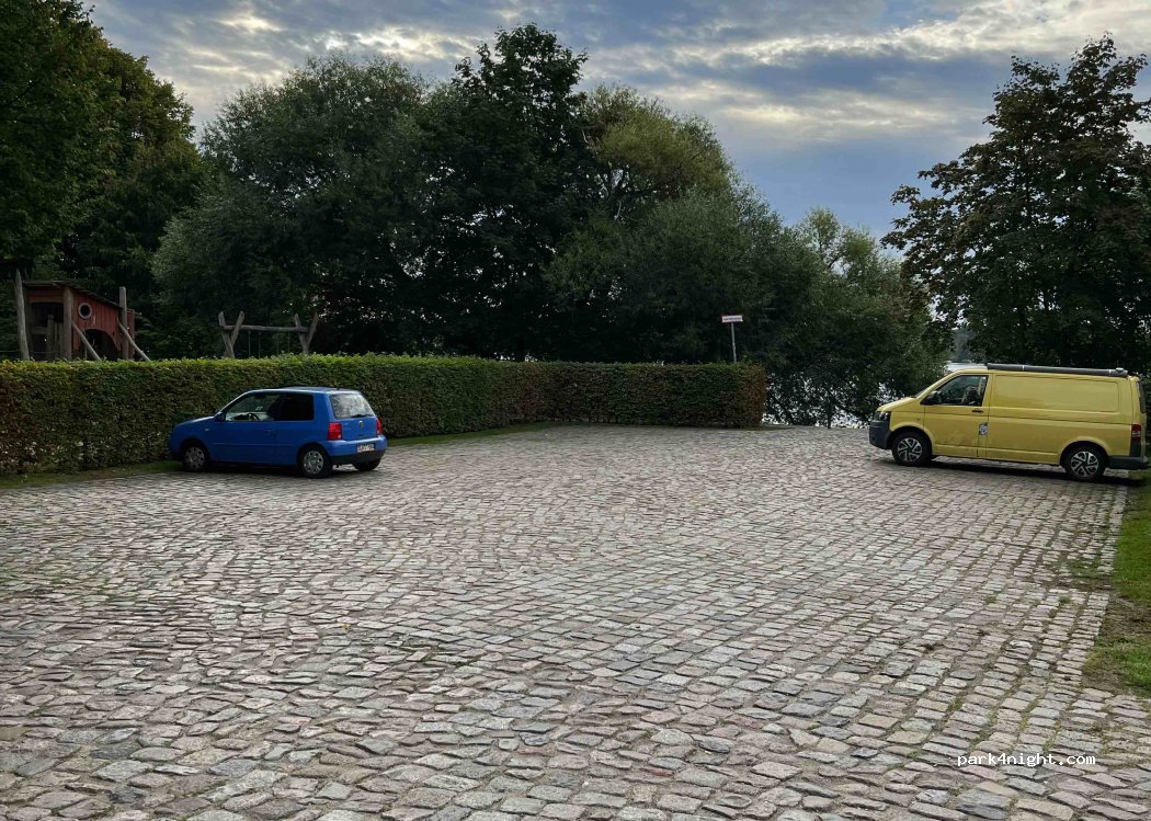 Mini Parkplatz mit Hecke umsäumt, direkt am See und neben einem grossen Spielplatz mit Imbis und Toiletten. Man kann gleich ins Wasser hüpfen. Der See ist trübe und der Boden an der Stelle etwas schlammig, aber das Wasser ist sauber. Nicht für größere Gefährte geeignet. Der Parkplatz ist kostenfrei soweit ich es überblicken konnte.