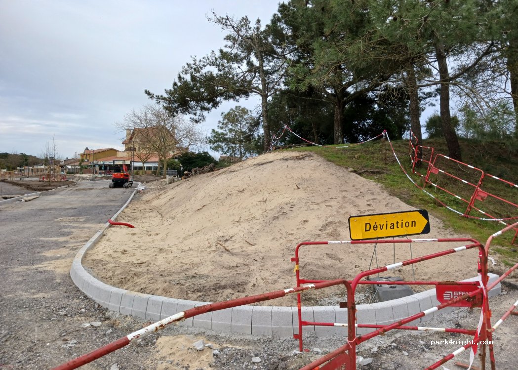 Pas très glamour, mais néanmoins calme malgré des travaux de voirie à proximité, plat, stationnement possible au moins jusqu'à 9 mètres, ombragé une bonne partie de la journée en hiver, on entend l'océan au loin. Merci à la municipalité de nous réserver cet endroit proche commerces (fermés à cette période) et à 400/500 mètres de l'océan.