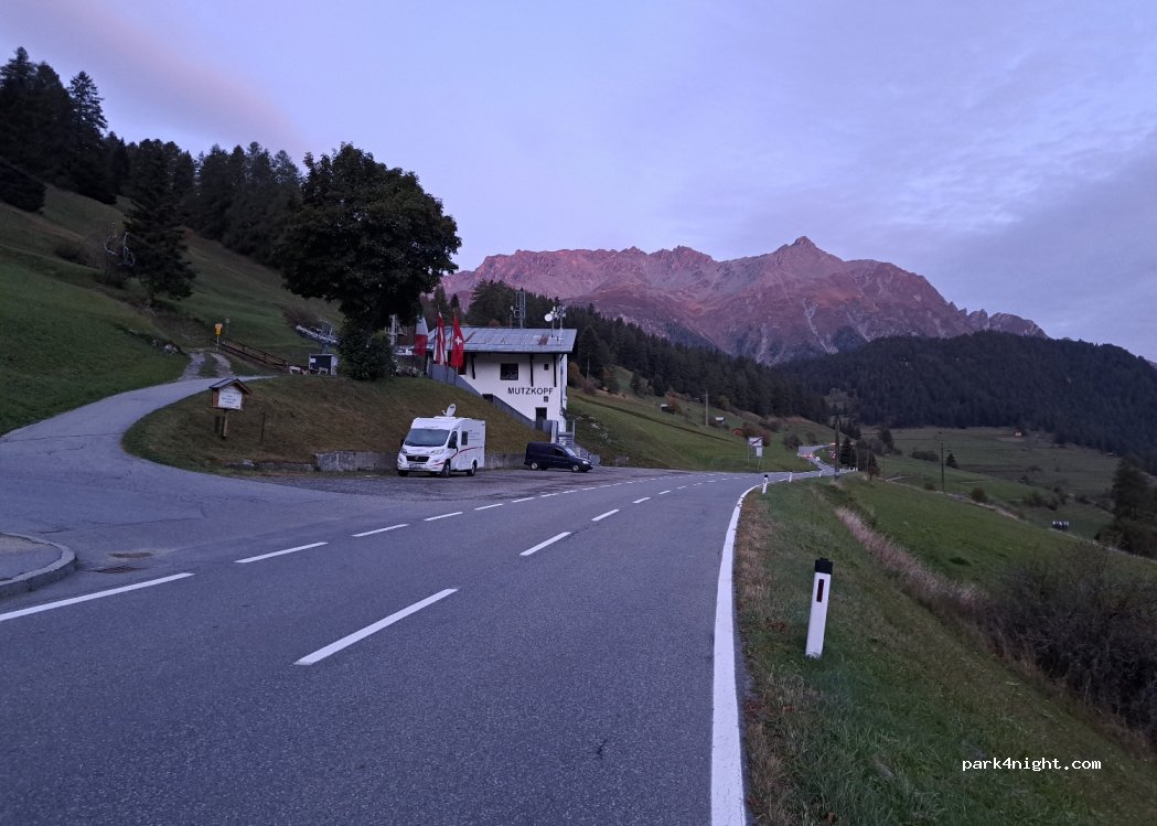 Parking public gratuit pour voitures et camionnettes. Près d'une route mais très calme la nuit. Des toilettes propres se trouvent dans le bâtiment 'Mutzkopf Sessellift'. Bon pour une simple nuit seulement - pas de camping. Ceux-ci se trouveraient quelques kilomètres plus haut dans le reschenpass.