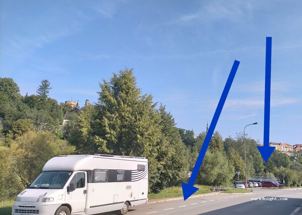 Stationnement gratuit, pas d'interdiction. Nous sommes restés dans la journée pour la visite de Tabor. Au calme, en bordure de rivière. Pour monter au village à pied, traversez le pont et prenez les escaliers en face. Il vaut mieux arriver par l'ouest afin de ne pas traverser le village (interdiction aux véhicules de plus de 2,5 tonnes), ou en passant par la route basse au sud du village.