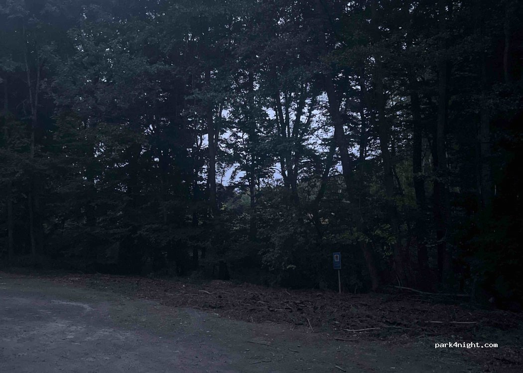 Ein großer Schotter Parkplatz. relativ gerade. Direkt neben einer Straße, mitten im Wald, die nachts nicht stark befahren ist. Im wasserschutzgebiet. Ein kleiner Mülleimer und eine Bank zum sitzen. Um seine fahrtauglichkeit über Nacht wieder auf zu frischen ok.