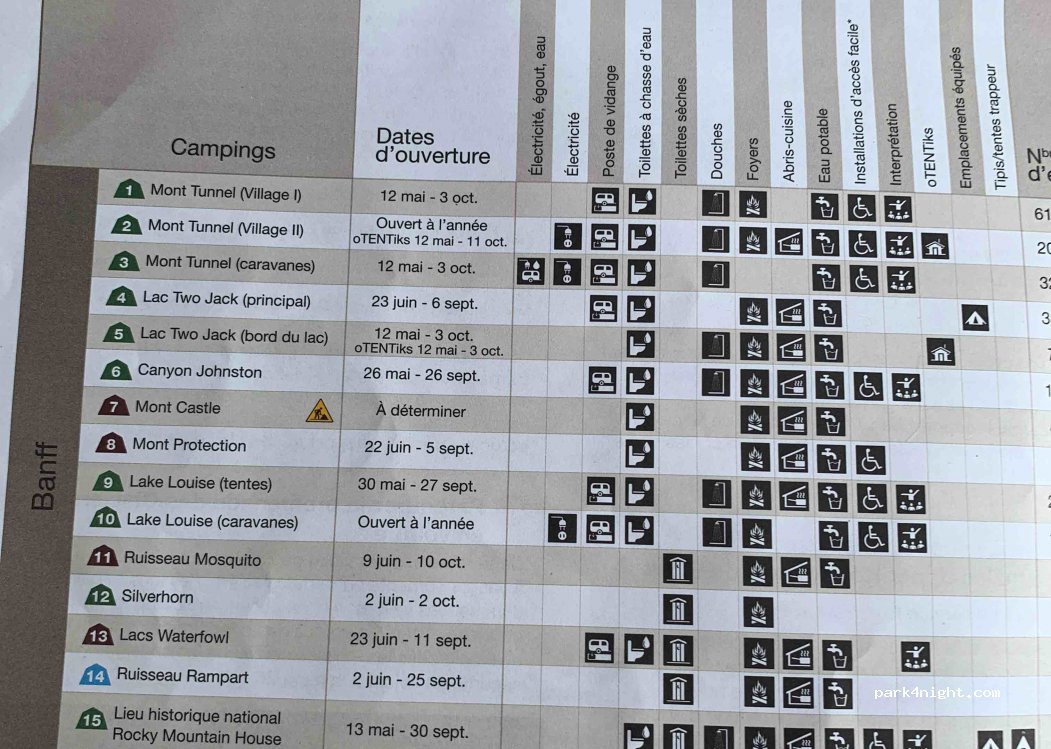 Two Jack Main Campground and Two Jack Lake Campground. Deux campings attenants. L’un des deux donne sur le lac magnifique. Au principal il y a la station de vidange mais on peut vider si on vient de l’autre, c’est compris dans le prix. 38,50$ la nuit en RV.