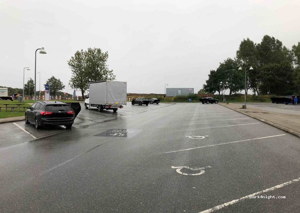 Aire de repos d'autoroute avec places de stationnement extra larges pour mobil-homes ou remorques.