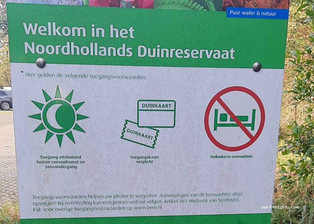 Het is verboden om te kamperen of te overnachten in het duingebied (inclusief parkeerplaatsen). Er worden hoge boetes uitgedeeld.