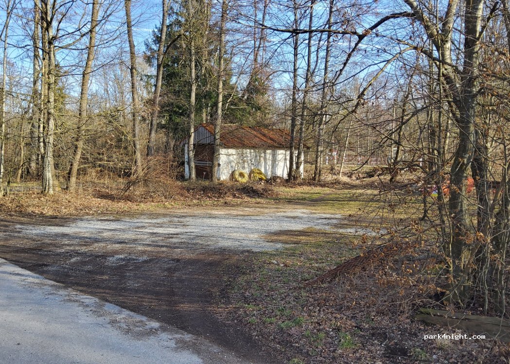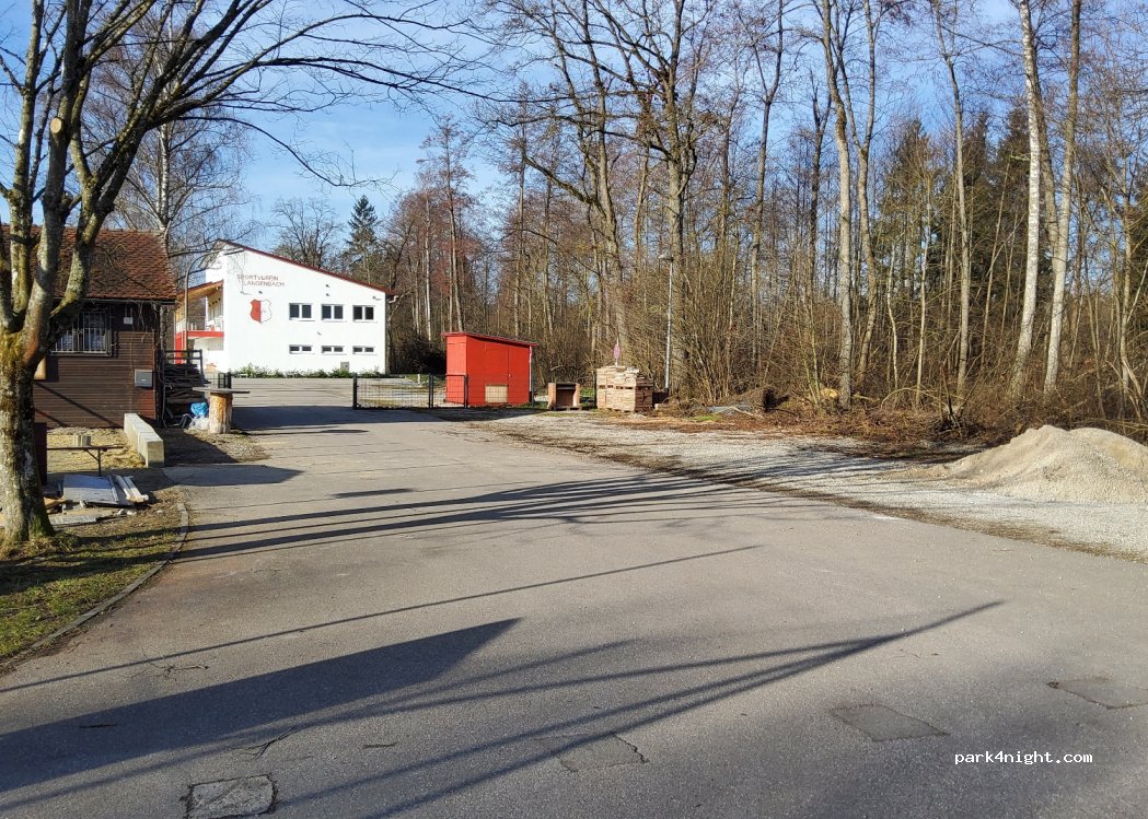 Sportanlage, Parkplätze überschaubar und direkt an der Durchfahrtsstraße. Beleuchtet und sicher für die Nacht