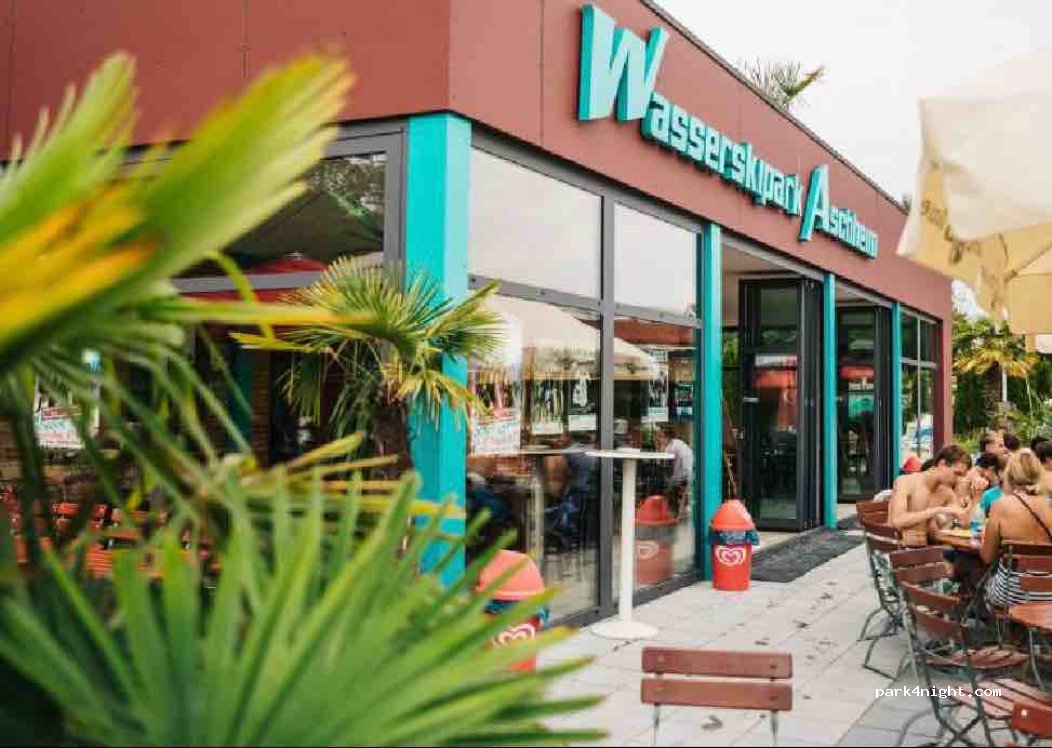 It is the parking lot of the water ski facility, for a small fee you can stay overnight here. In addition to the water ski facility, there is a mini golf course and an event location with beach volleyball courts. There are restaurants and the sanitary facilities of the water ski facility can also be used