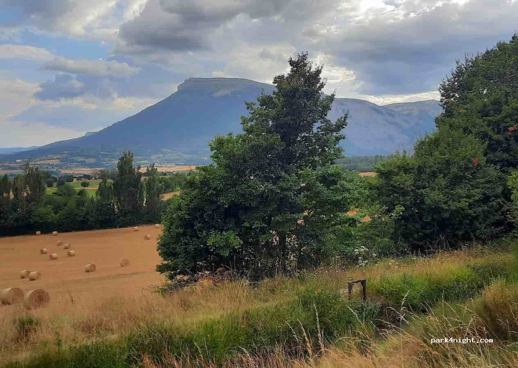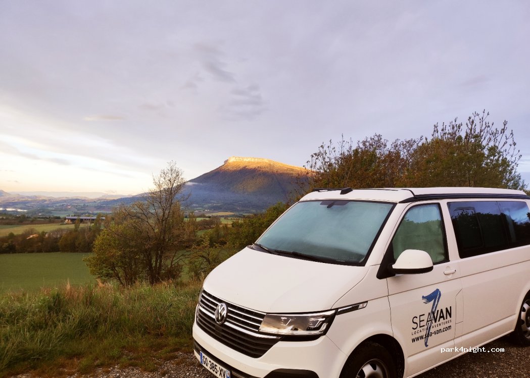 Petit parking avec juste quelques places (pas de limite de hauteur) en bordure d'une route passante mais limitée, pas de services cependant, une jolie vue sur Ceuze et la vallée.