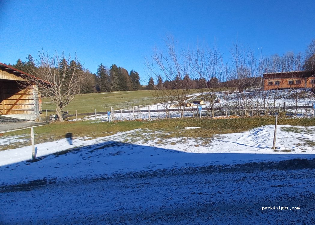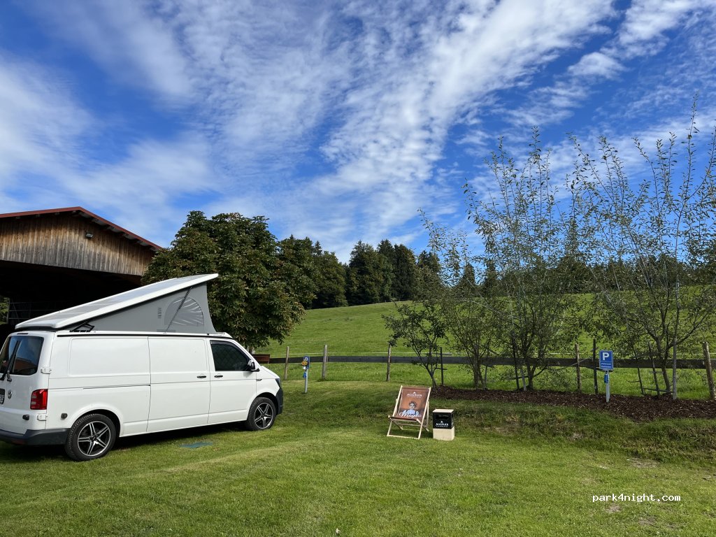 Schöner Bauernhof relativ weit oben am Berg, mit Hofladen, Wasser, Strom (keine WC-/Grauwasserentsorgung). Es sind mehr als die 3 abgegebenen Stellplätze. Wir waren zu insgesamt 7 Campern dort. Wir kamen zum Ende der bayerischen Herbstferien spontan und haben noch einen Platz bekommen. Freundliche Gastgeber. Arbeit auf dem Hof/Lärm hat uns nicht gestört. Frühstücken bei Kuhgeleut. Rund 30€/Nacht