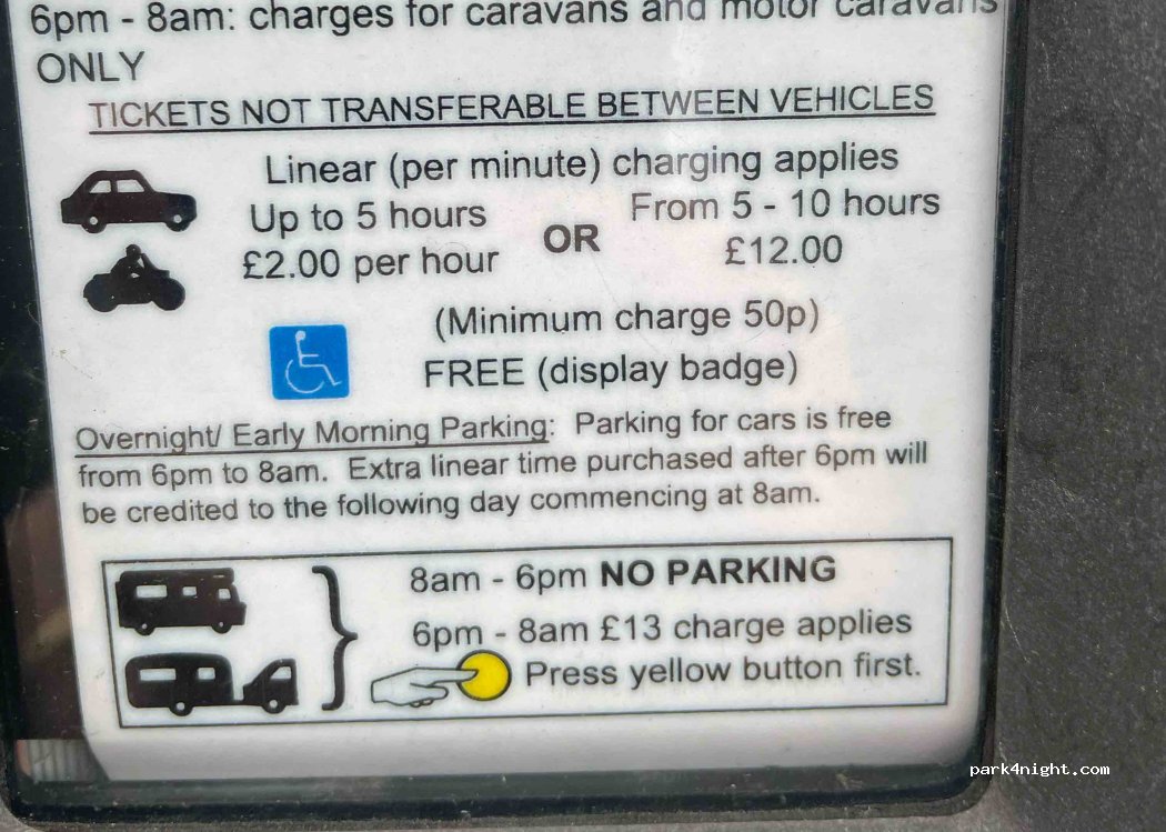 Parking muy caro y (por qué será?) totalmente vacío (se ve en las fotos) también de día. 2£ por hora las 5 primeras horas más 12 £ por el resto del día hasta las 24 hs (precios de 2024). Si tienes autocaravana solo puedes pernoctar, teniendo que marchar a las 08:00. Eso sí, muy buenas vistas.