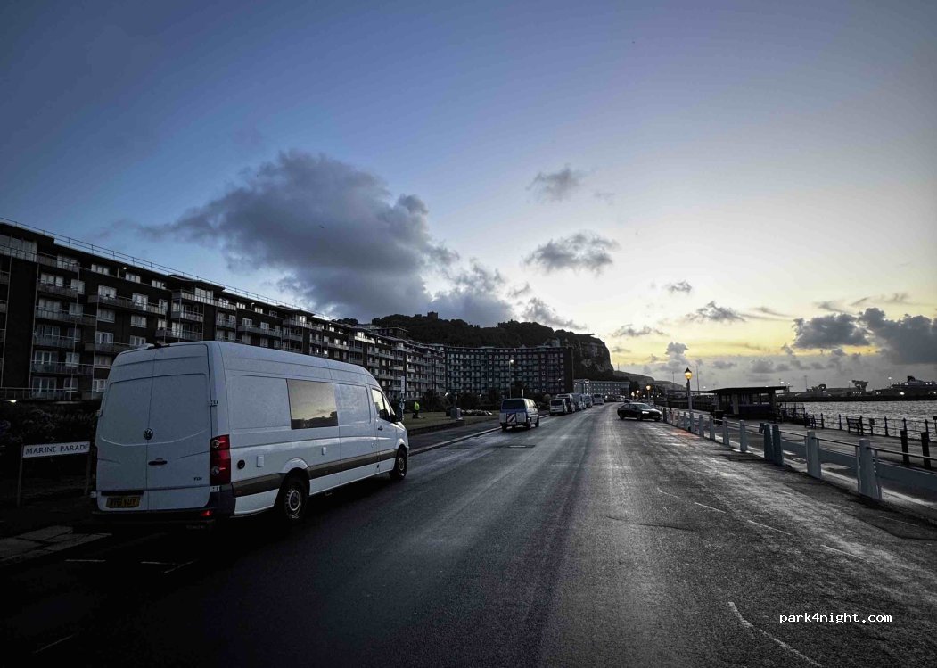 This street used to be free to park but now Dover District Council have legitimised the parking and are charging £11 which on my opinion is OK. It is noisy as others have suggested but it is very near the ferry terminal. There are several restaurants along Marine Parade but it is easy to access the centre of town Note it is not possible for motorhomes to park before 18.00 due to restrictions