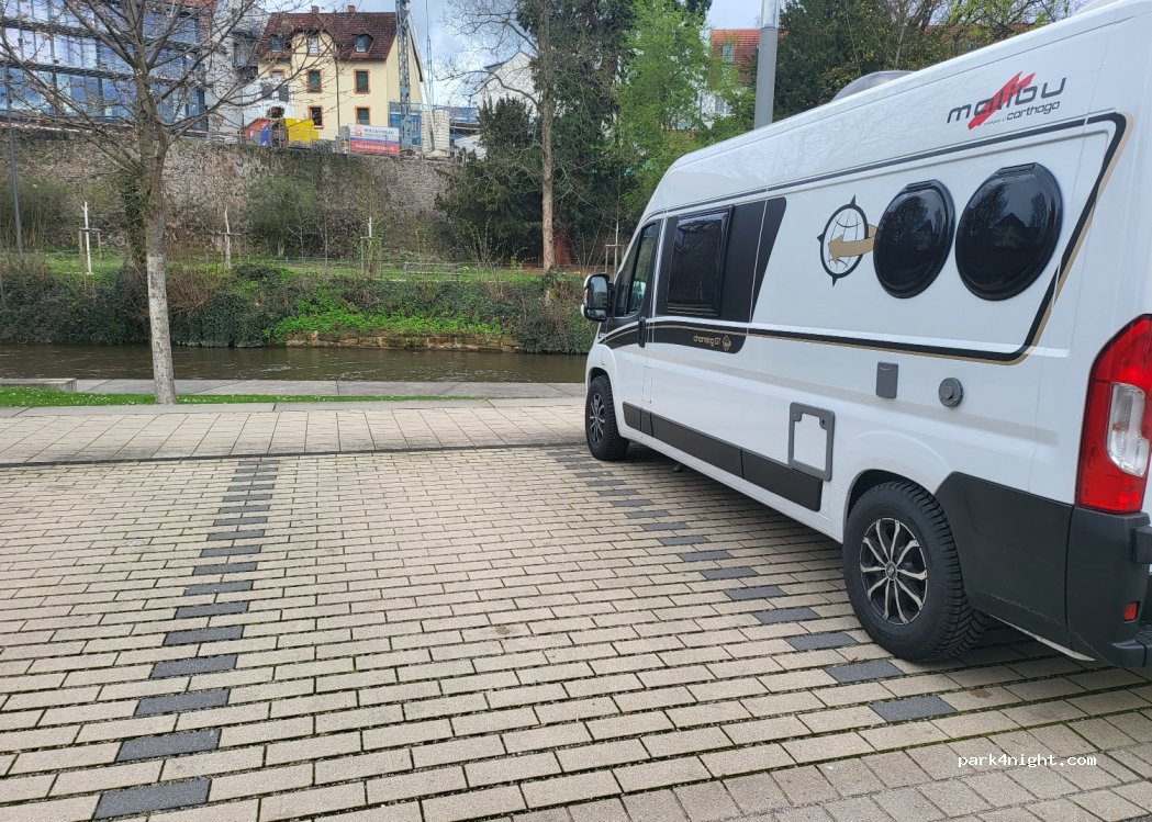 Sehr nett übernachtet. Ist ein ganz normaler Parkplatz idirekt am Mühlbach und sehr zentral. Für unseren Cali perfekt. Kostenlos von 19 bis 9 Uhr. Toiletten gibt’s im Kino (20 m) und WLAN bei der Zäpfle Bar (neben dem Kino)