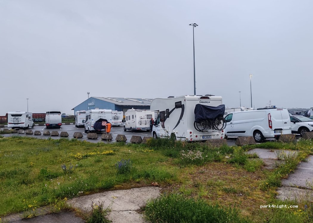 Great spot for catching an early morning ferry but very busy, we arrived at 7.00 in the evening and very few spaces even in a large parking area. Some very large units took two spaces which is fine but other smaller units taking up two spaces unnecessarily which stopped later vans being unable to park. It was noisy during the night but expected, it did the job and was very convenient and only €4.