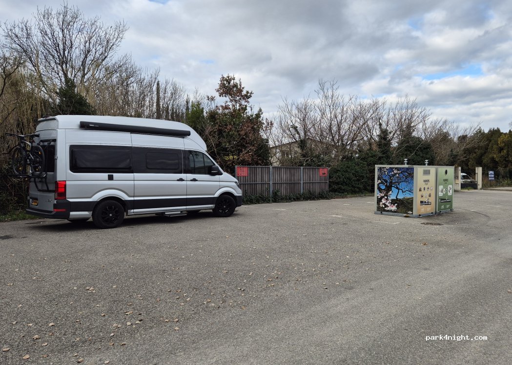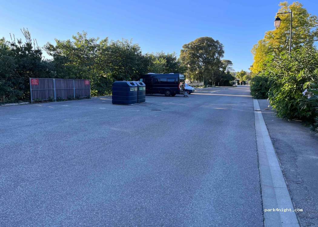 Prima gratis parkeerplaats zonder beperkingen. Alleen afvalbakken en lozing water mogelijk in speciale voorzieningen. De camping van Maussane les Alpilles is vanaf november tot 15 maart gesloten dus dit is een ideale uitwijkplaats. Heel rustig gelegen aan rand van het dorp Maussane, slechts af en toe komen dorpsbewoners hun lege flessen in de glasbak deponeren