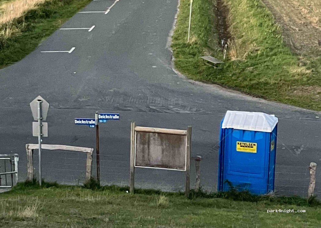 Abgegrenzte Parkplätze an einer Straße mit Zugang zu den Dixi-Toiletten. Ein wunderbarer Blick auf Cuxhaven vom Deich. Rundherum Grünflächen und Landwirtschaft. Hatte bereits einen anderen Standort, sonst wären wir hier geblieben.
