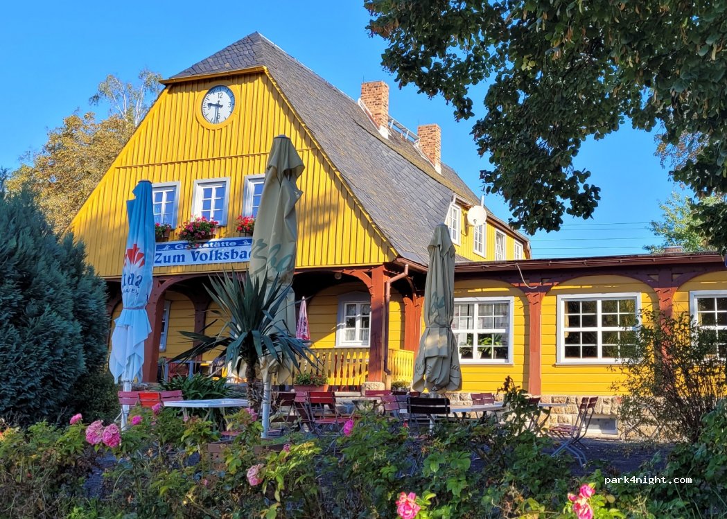 Parking at the Volksbad for all vehicles. Undivided parking spaces on level split/grass subsurface with large and small trees. Parking ticket machine is (end of September) dismantled. We stayed here alone for one night. Very quiet, restaurant (good regional cuisine at moderate prices) and swimming pool 150 meters away. Please do not dispose of rubbish!