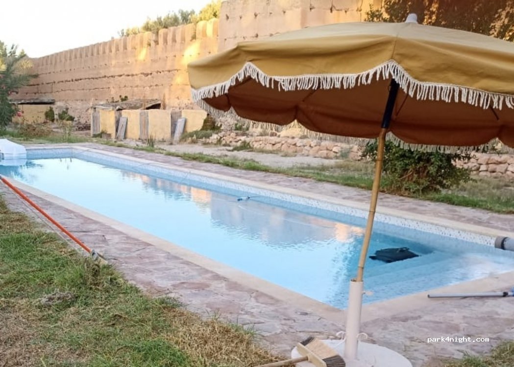 Camping for tents, 4x4s, motorbikes and motorhomes. 25 pitches, near the Ouijjane palm grove, 25 km from Tiznit, 40 km from Aglou beach. Calm and tranquility, catering possible. With private swimming pool.