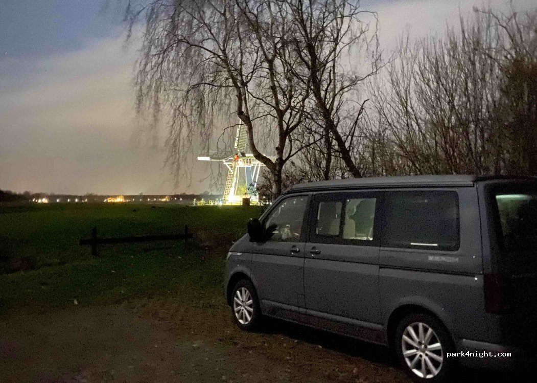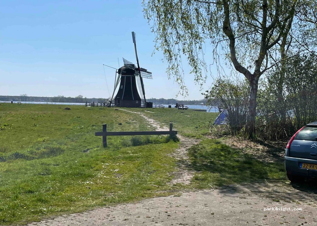 Parking by the water, surrounded by greenery and not far from the city of Groningen. No size limit but a very narrow bridge to get there, motorhomes do not pass in my opinion. Well insulated, very quiet at night. A few restaurants and toilets/showers towards the marina 2-3km away. Superb view of the lake and a working mill.