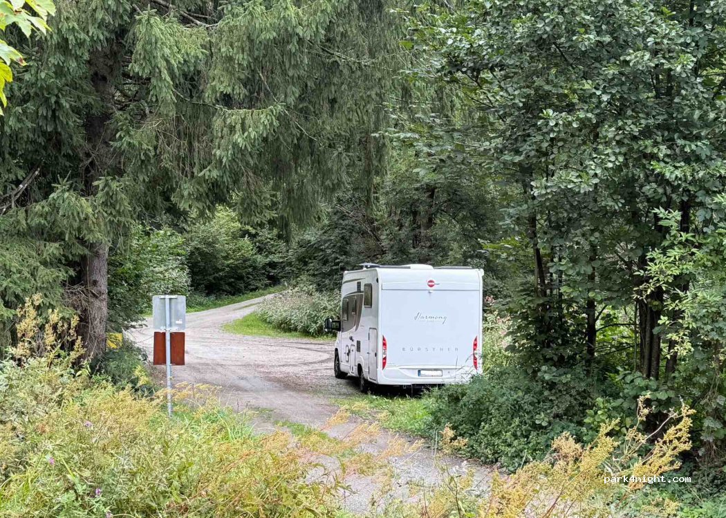 Hiking car park for Stauf Castle ruins. The road is not far away and audible. Hardly any cars drive here at night. Space for 3 mobile homes. Okay for one night.