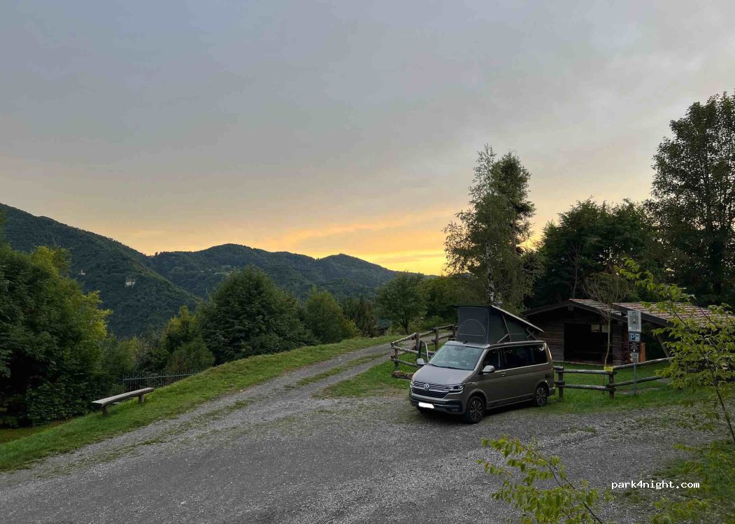 Le lieu est top ! La route pour y accéder est étroite, possible en van en faisant attention. Je dirai 4 stationnements possibles sur place mais surtout une aire de pique nique, avec abri si pluie et barbecue. À 50m une vue magnifique sur le lac d’idro ! Nuit très calme et silencieuse.
