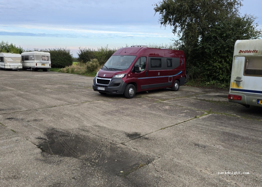 Garé face à un hangar agricole qui sert pour l'hivernage, 17,50 € pour deux, sans électricité et en espèce uniquement, une étoile pour la dalle en béton, les poules, le dindon et le chien