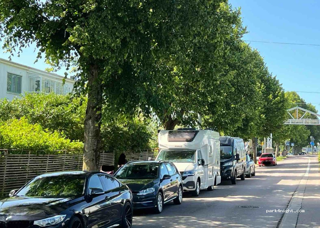 On a Monday we parked our 6m motorhome further along this narrow, one way road where the parking limit is only 2 hours. It was the only available space at the time. We displayed our parking disk. It was enough for a quick visit to the beautiful park and to see the animals. We were not broken into or robbed. There seems to be only one way out of this neighbourhood from this road.